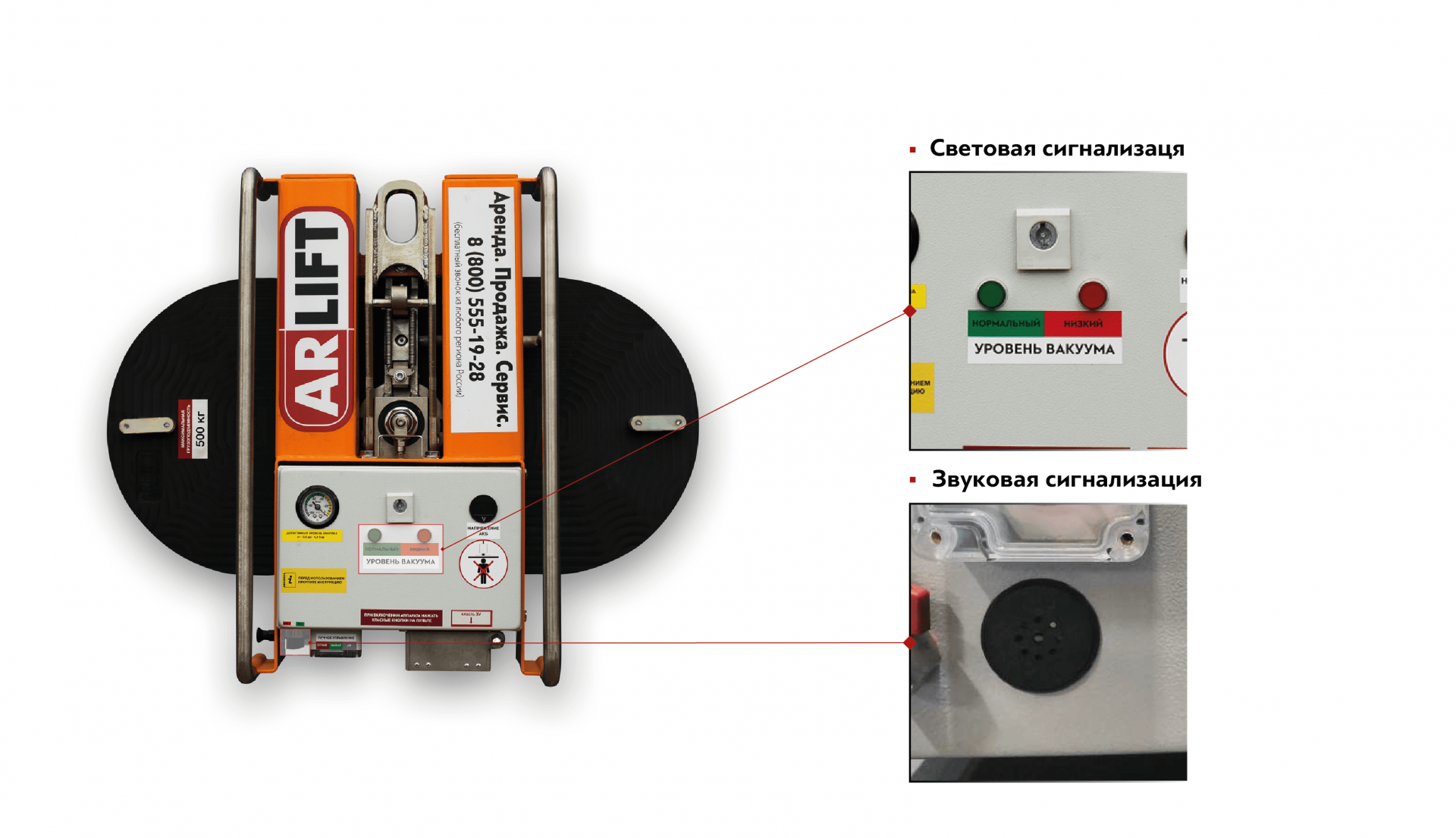 3. Вакуумный захват должен быть оборудован системой индикации утечки уровня вакуума, включающей аварийную сигнализацию при достижении порогового значения. Аварийная сигнализация должна быть световой и звуковой, а также должна быть легко видимой и слышимой оператором