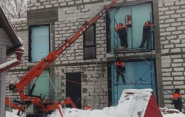 Неизменный тандем мини-крана Jekko SPX 527CDH и вакуумного захвата ARLIFTER GS-750 работал в городе Котельники Московской области на остеклении коттеджа