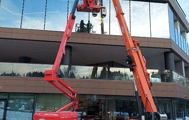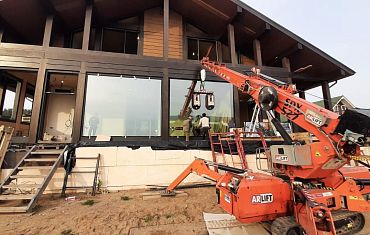 Коленчатый подъемник, мини-кран и два вакуумных захвата Airlifter GS-850 на траверсе помогли смонтировать тяжелые стеклопакеты.