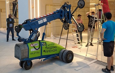 Вакуумный захват GS-500 и коленчатый подъемник LGMG AR16J помогли при монтаже макета для «РМК-Арены» на Урале.