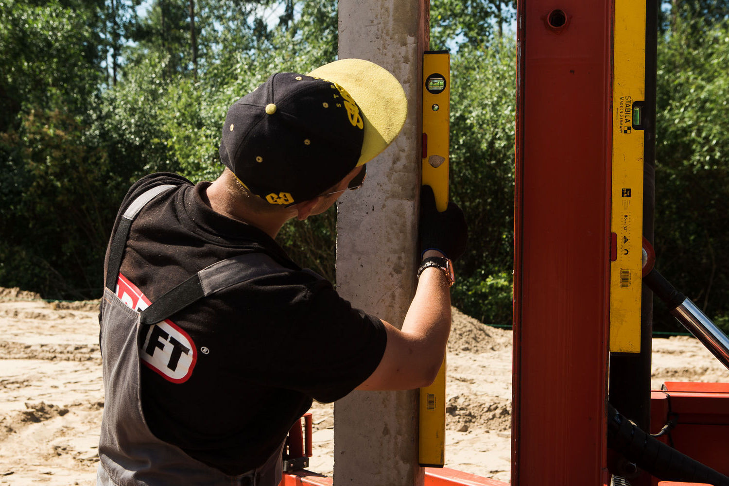 Забивка свай происходит при помощи мини-копровых установок. На первом этапе свая устанавливается и выравнивается вертикально на глаз. Использование механизмов обеспечивает надежную фиксацию и минимальное отклонение от вертикальной оси. После нескольких ударов молота производится контроль положения пузырьковым уровнем в двух перпендикулярных плоскостях. Свая окончательно выравнивается посредством соответствующего перемещения копра.