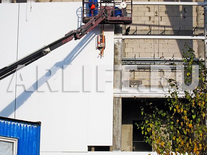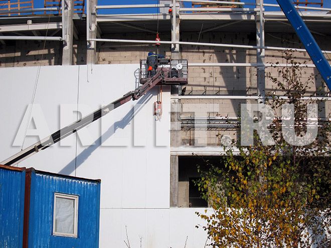 Работы по монтажу сэндвич-панелей велись двумя вакуумными подъемниками (захватами) ARLIFT — Glass Boy 500. Осуществлялся сложный монтаж вертикальной раскладки сэндвич-панелей длиной до 11 метров.