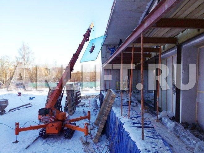 ООО «Единая Алюминиевая Компания» произвела застекление Культурного центра в Московской области (Ленинский р-н, п/о Марьино). С помощью мини-крана Jekko 1040 и вакуумного подъемника Glass Boy 750 были смонтированы стеклопакеты размером 2 х 3 м, весом 550 кг.