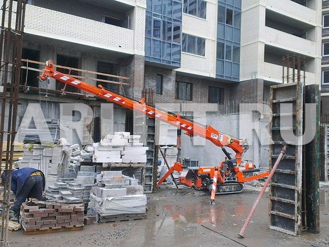 Классический мини-кран JEKKO SPD360CDH компании «Арлифт» участвует в строительстве жилого дома в Санкт-Петербурге. Компактный кран-паук оснащен 12-метровой стрелой, а его максимальная грузоподъемность составляет 1,8 т, поэтому кран быстро и легко устанавливает блоки опалубки.
