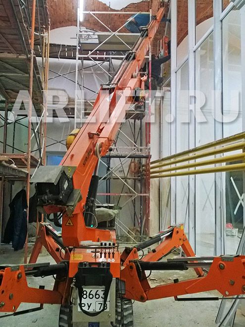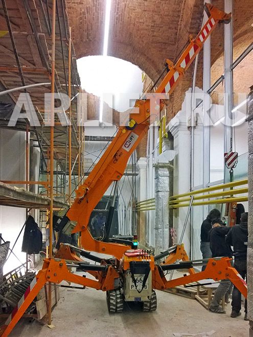 Мини-кран компании «Арлифт» Jekko 360 и вакуумная присоска GlassBoy500 смонтировали огнеупорные стекла со стороны технического помещения, где будут храниться выставочные экспонаты. Работы были произведены в очень маленьком пространстве — шириной не более 2,5 метров, между строительными лесами и колоннами здания.