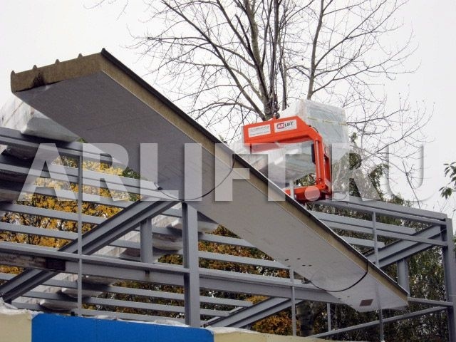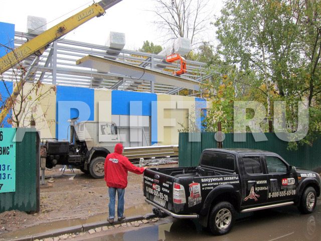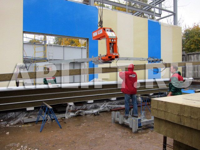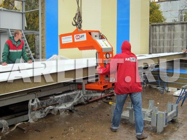 Работы велись в стесненных условиях, на улице шел дождь, что доставляло монтажной бригаде много неудобств. На помощь пришел вакуумный подъемник RotaBoy, который быстро и качественно поднял кровельную сэндвич-панель длиной до 15 м и весом 500 кг и без труда перевернул её во время монтажа.