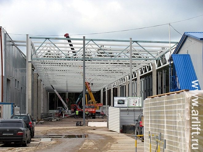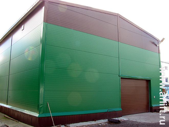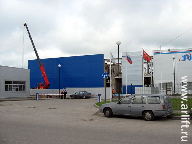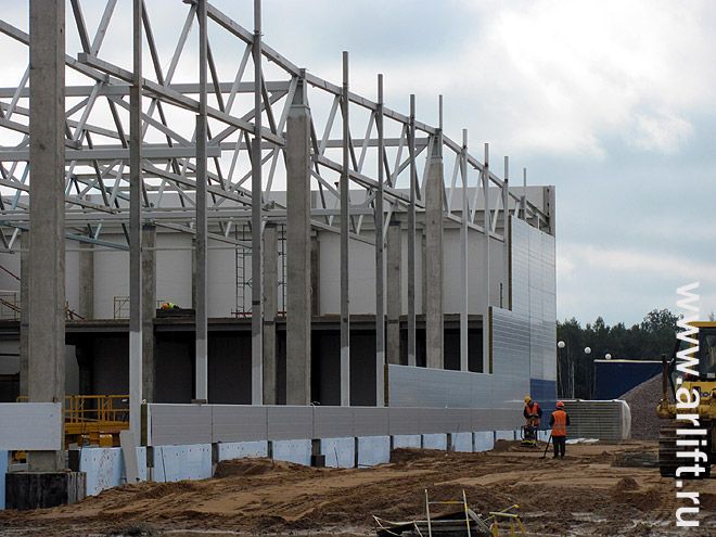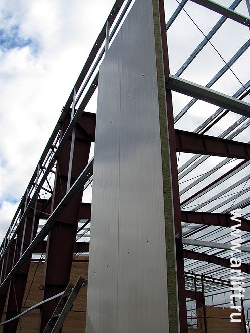 Монтаж стеновых сэндвич-панелей в ходе возведения складских помещений на Карпатской улице (Санкт-Петербург).