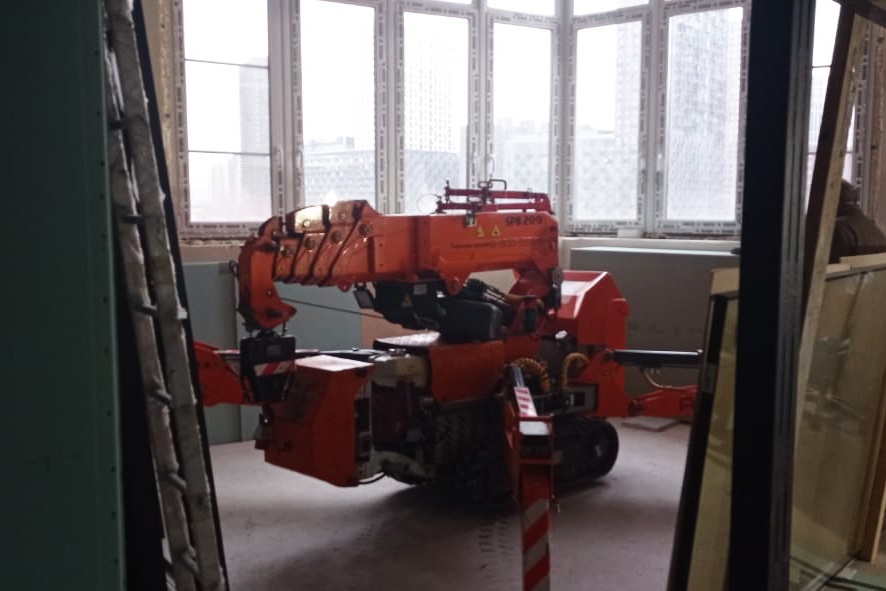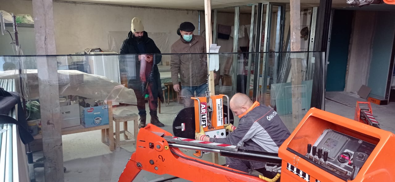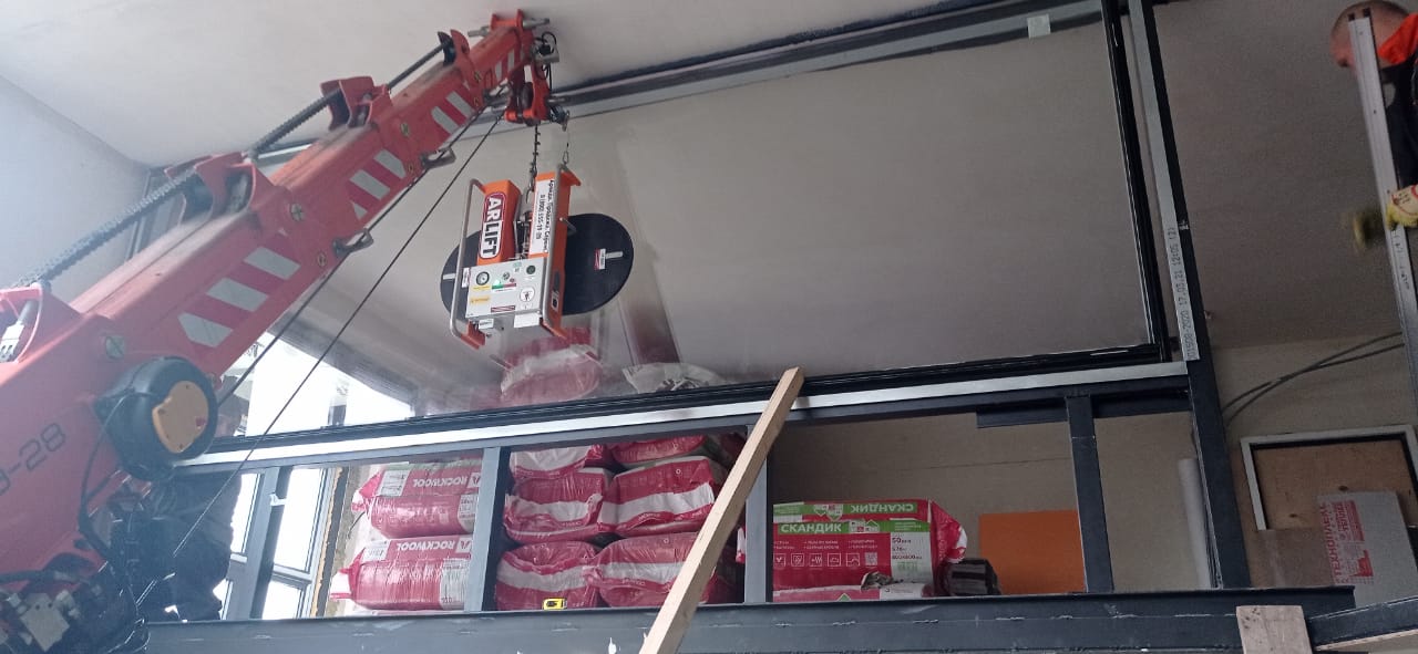 Установку перегородки внутри квартиры вместе с мини-краном помогал осуществить вакуумный захват собственного производства компании — Arlifter GS-500. Оборудование предназначено для монтажа стекла и сэндвич-панелей весом до 500 кг.