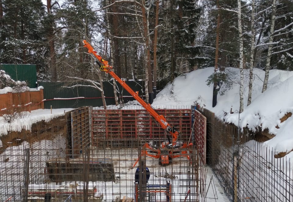 Так, для монтажа опалубки одного из строящихся домов в Московской области использовали мини-кран компании Арлифт SPD360CDH с грузоподъемностью до 1800 кг и максимальным вертикальном вылетом стрелы в 13 метров.