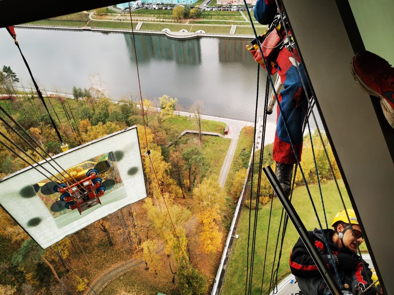 Для остекления здания правительства Московской области были привлечены самые лучшие специалисты и оборудование. Естественно, ведь работы проводились на высоте птичьего полета.