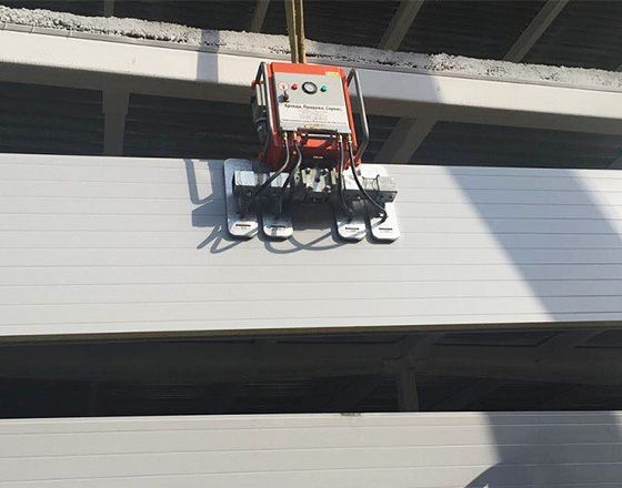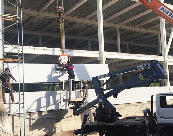 В рамках строительства масштабного торгового центра в городе Алма-Ата вакуумным захватом ARLIFTER SP-4 производился монтаж сэндвич-панелей.