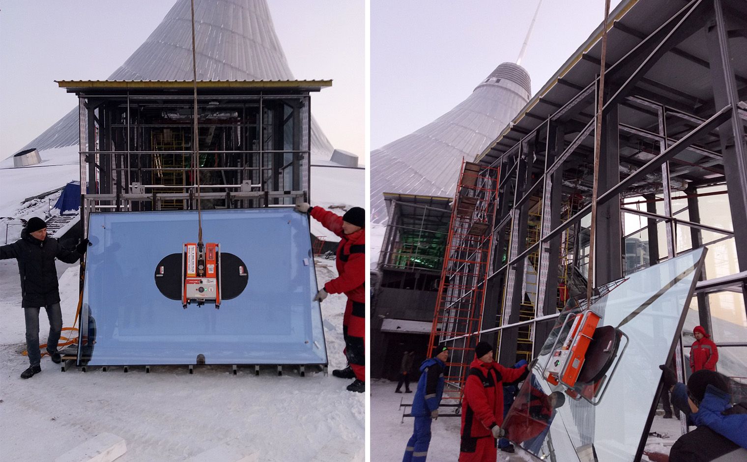 Для монтажа использовались широкие стекла весом 250-300 килограммов. Несмотря на то, что монтаж производился при температуре -25°, остекление было выполнено в кратчайшие сроки. Вакуумный захват ARLIFTER GS-750 как всегда продемонстрировал, что предоставление гарантии качественного и оперативного монтажа – не просто слова.