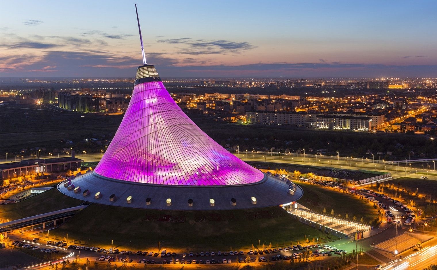 Торгово-развлекательный комплекс «Хан Шатыр» расположен в самом центре Астаны, столицы Казахстана. Сооружение впечатляет и своей архитектурой – здание выполнено в виде шатра, и своими габаритами – 150 метров в высоту, 127 тысяч квадратных метров общей площади.