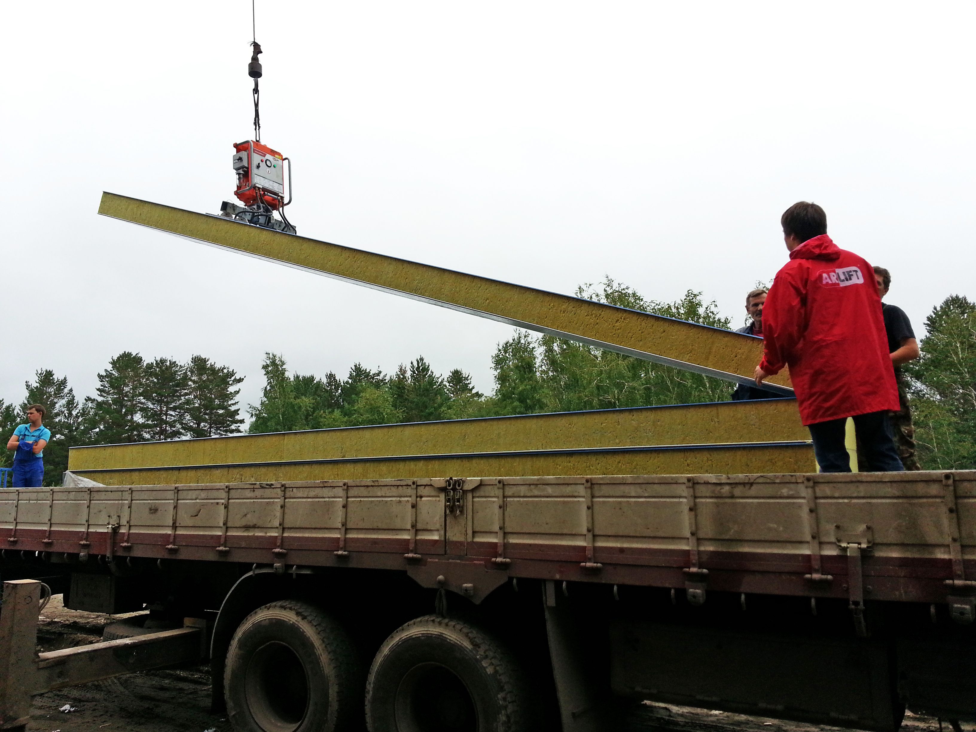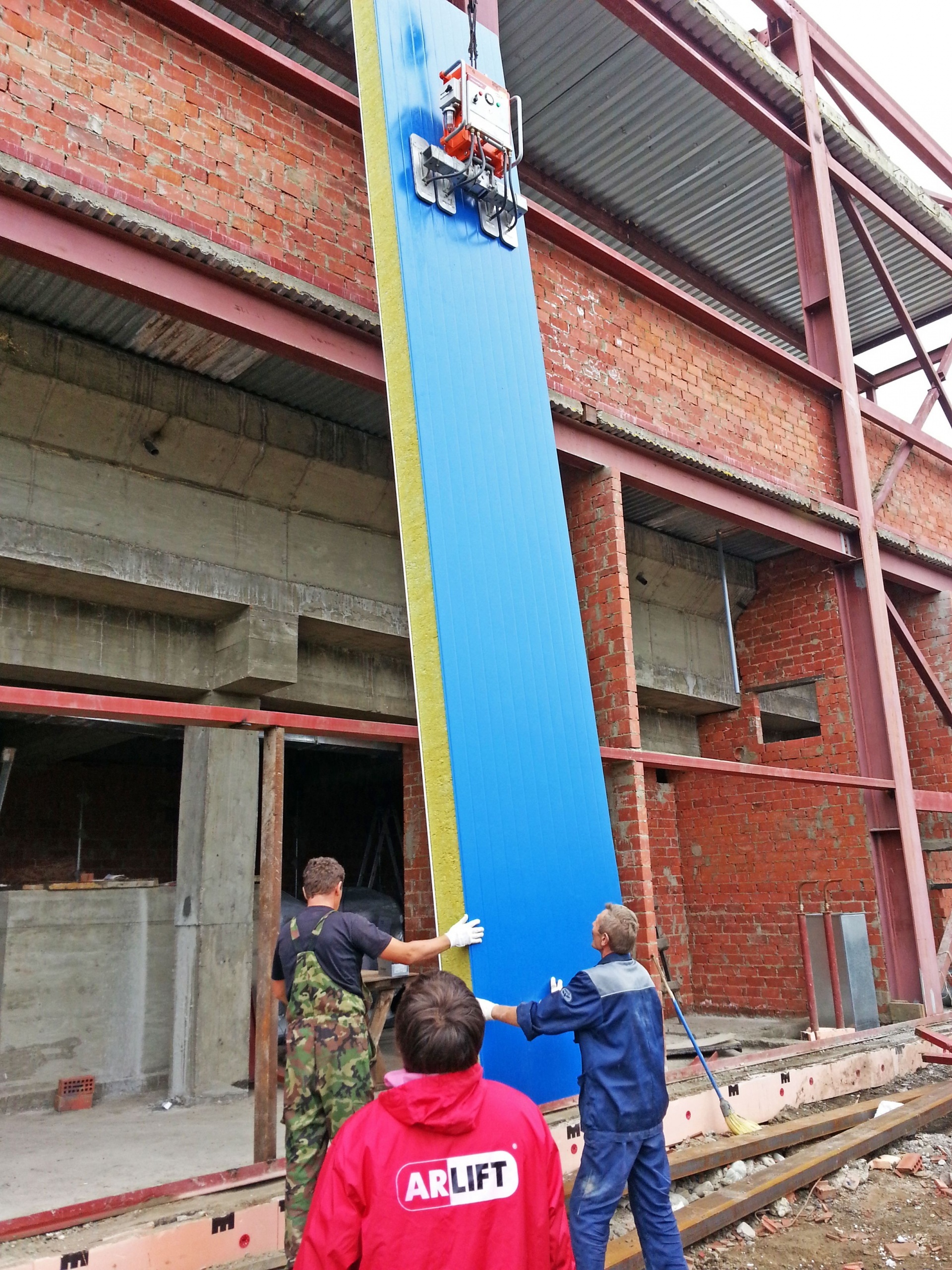 Монтаж 15-ти метровых стеновых панелей вертикальной раскладки с помощью вакуумного захвата ARLIFTER SP-4.