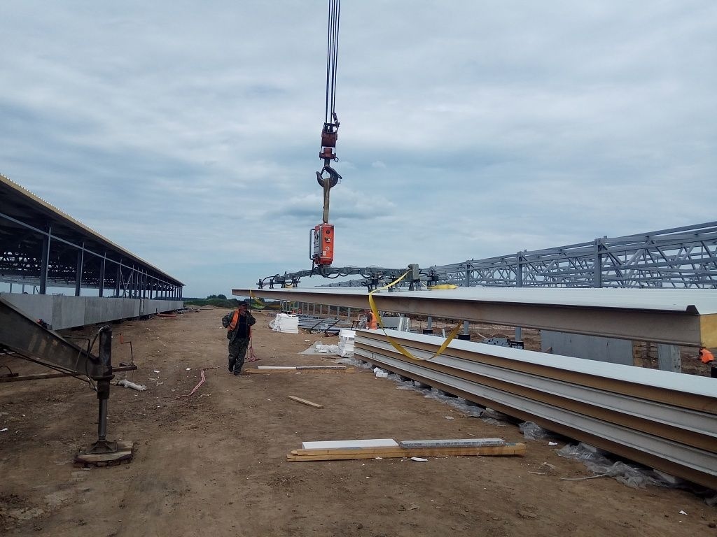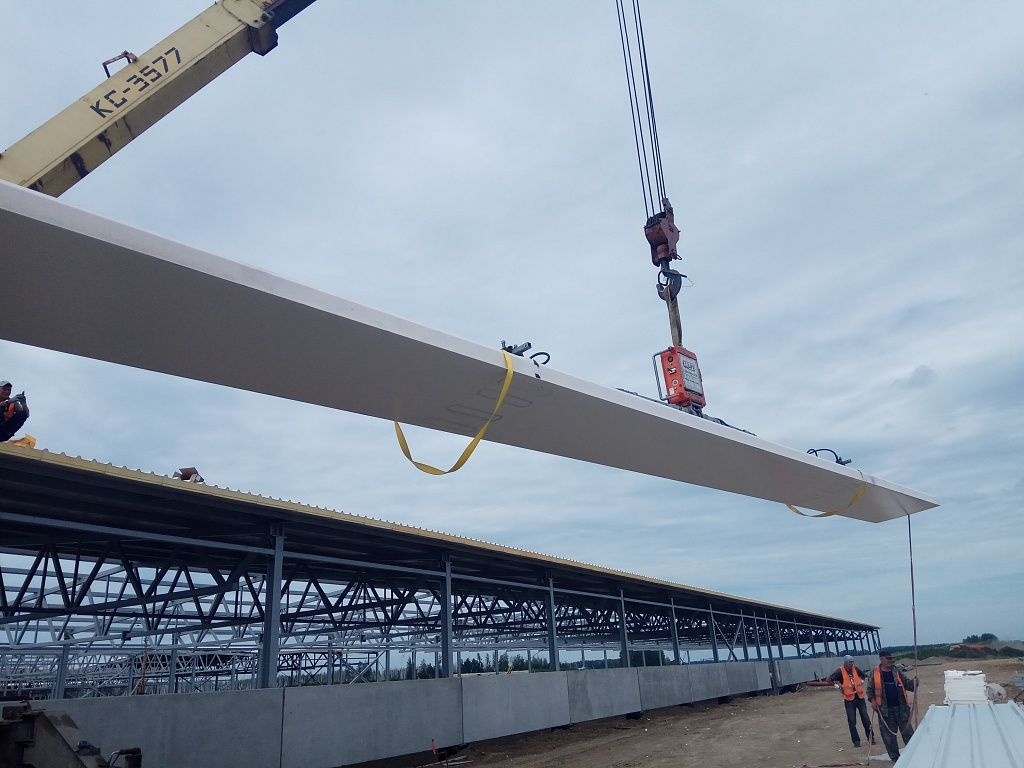 В рамках строительства складского комплекса в городе Томск производился монтаж кровельных сэндвич-панелей длиной 12 метров и толщиной 300 мм, весом 620 килограмма с помощью вакуумного захвата ARLIFTER SP-4.