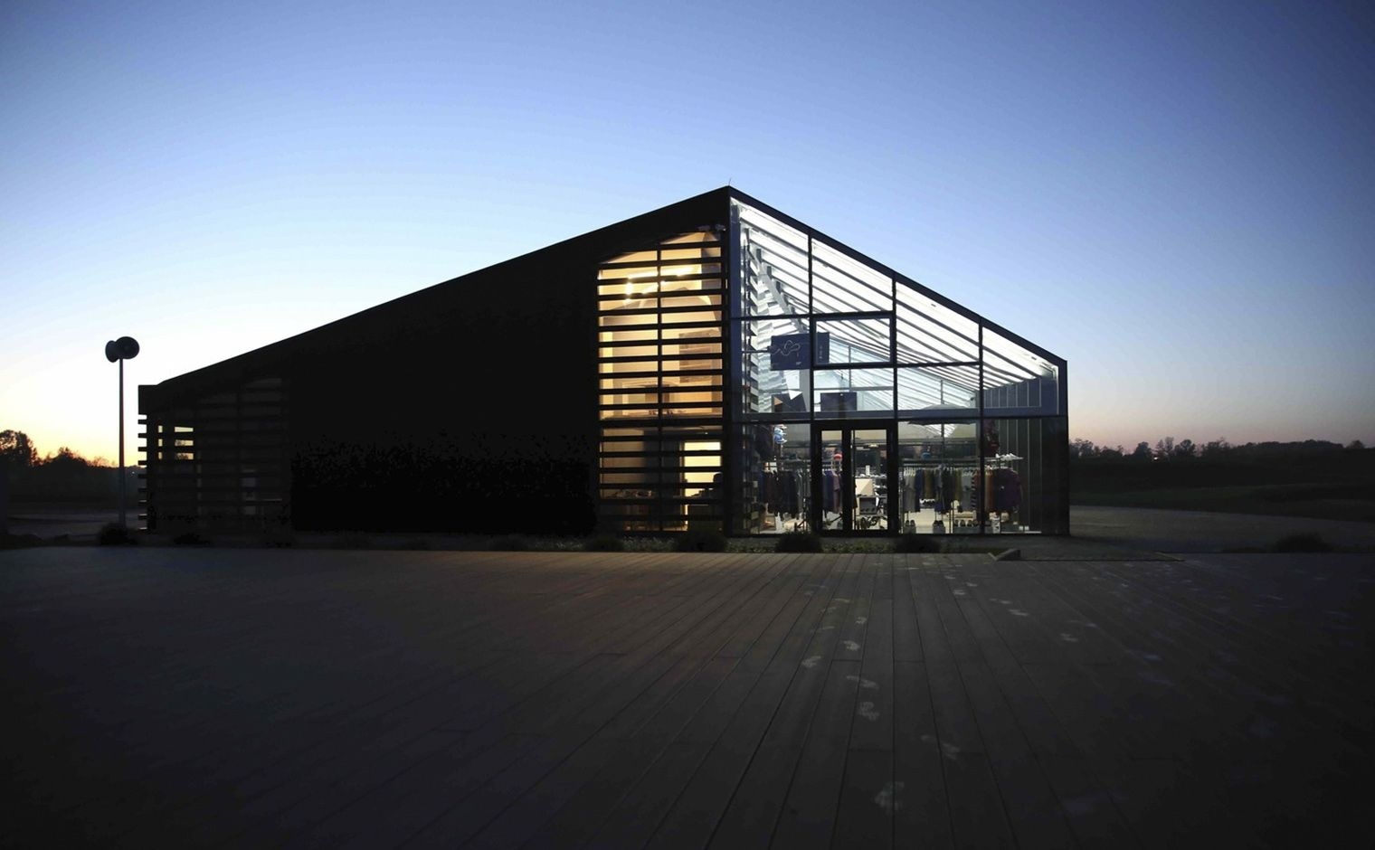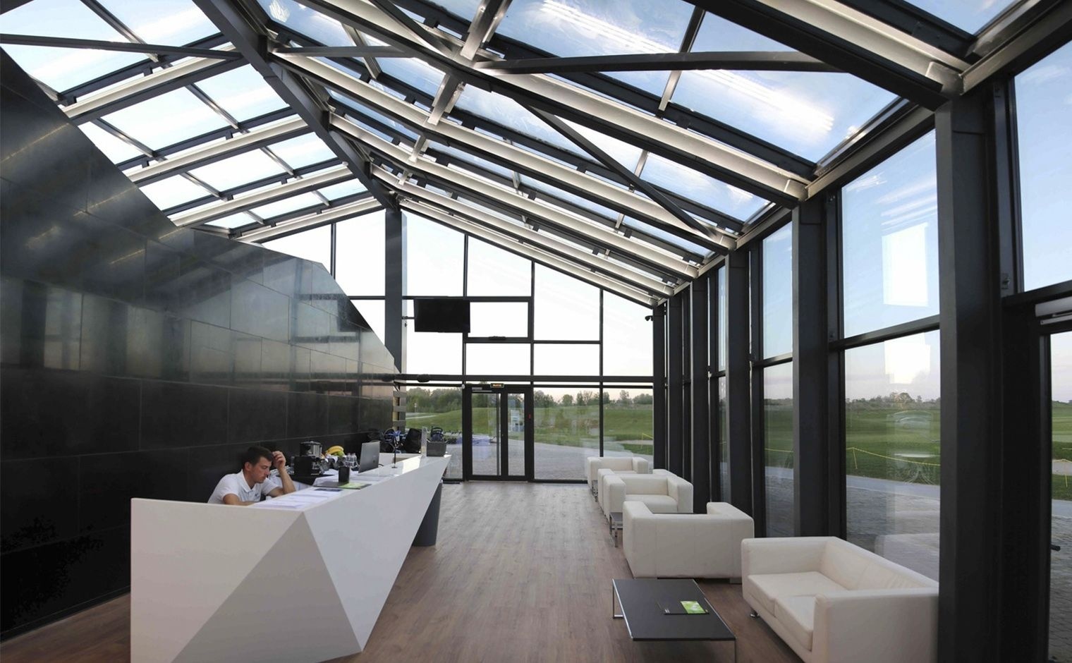 Часть здания гольф-клуба выполнена из стекла. Прямые геометрические формы, намеренная ассиметрия и необычность конструкции лежат в основе дизайн-проекта. Из стекла выполнены не только стены, но и крыша. Это позволяет наслаждаться панорамными видами, достичь максимального взаимодействия с окружающими ландшафтами.
