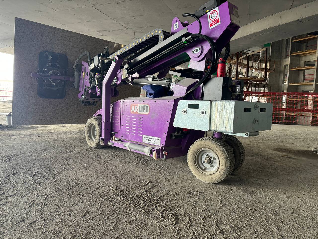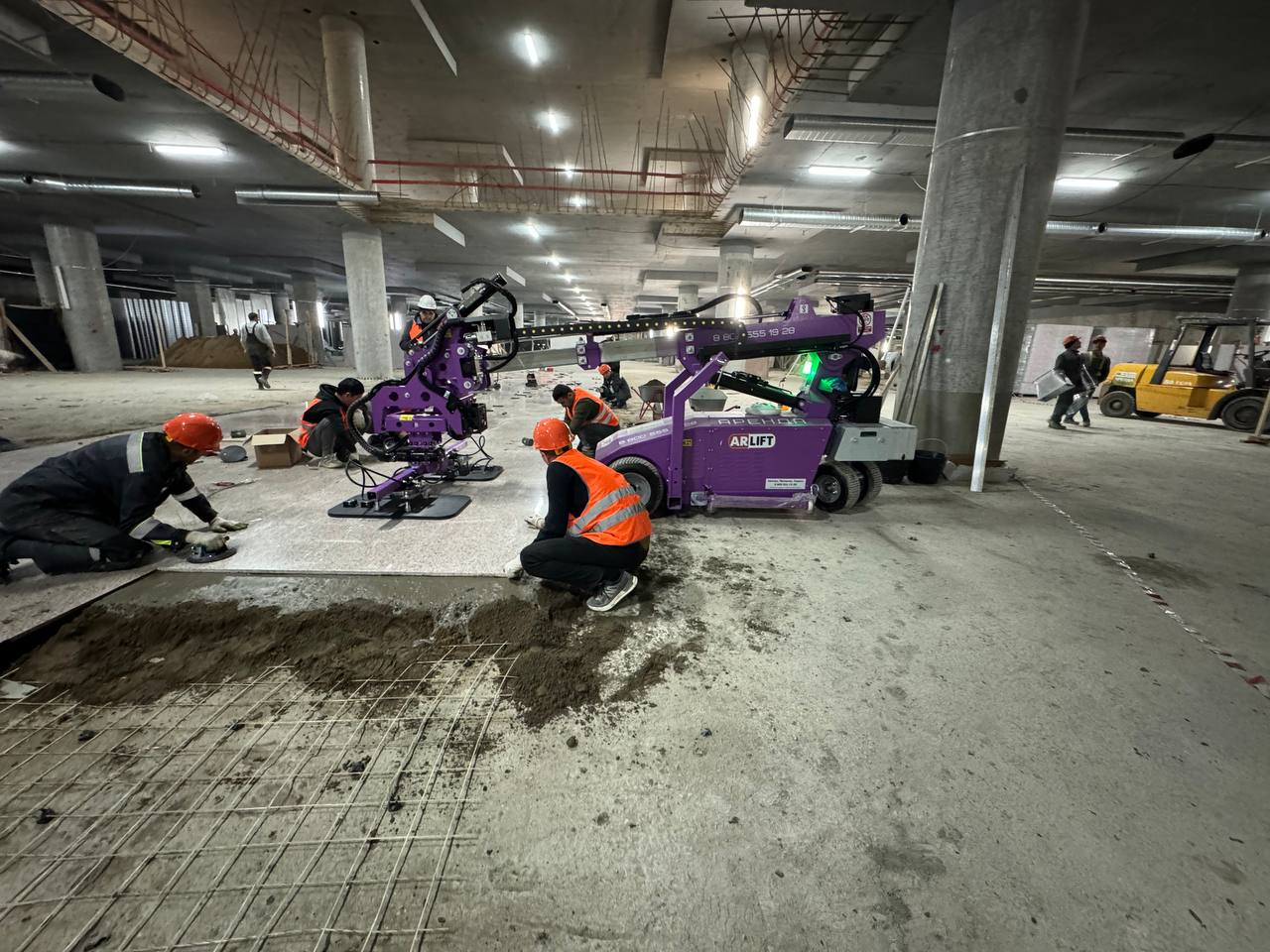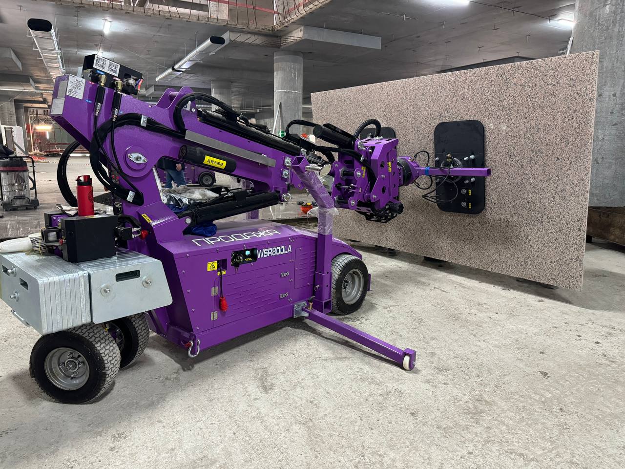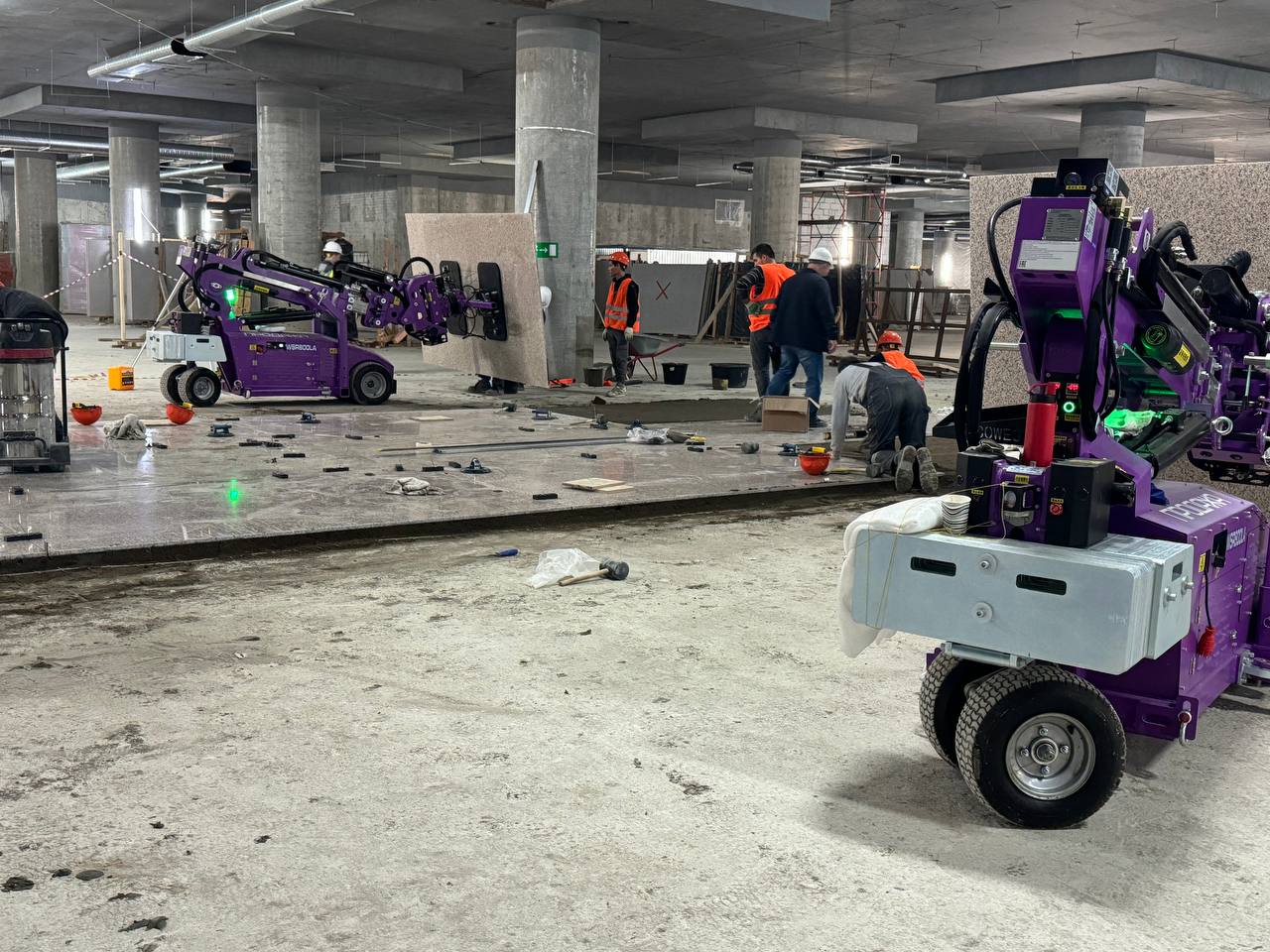 В этот раз для монтажа напольного покрытия использовали сразу несколько стеклороботов Арлифт WSR-800LA. Эта модель с грузоподъемностью до 800 кг имеет вертикальный вылет 4 метра, а горизонтальный — 223 метра.