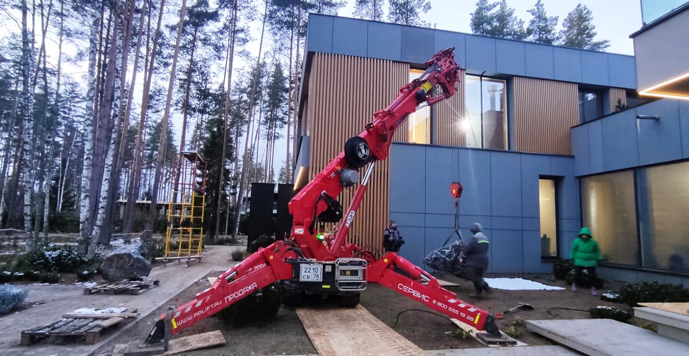 В одном из пригородов Санкт-Петербурга мини-кран SPT499 помог с монтажом камней на территории приусадебного участка. Арлифт SPT499 — гусеничный кран с телескопической стрелой и максимальной грузоподъемностью 5000 кг. Максимальная высота подъема — 17.5 метров, горизонтальный вылет — 16.5 метров.