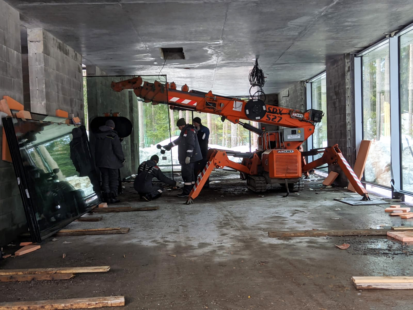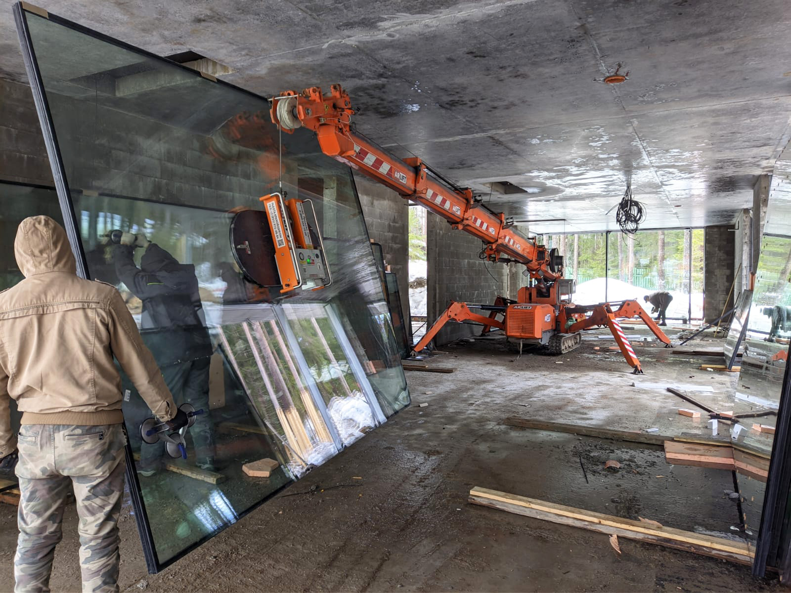 Мини-кран SPX527 и вакуумный захват помогли остеклить частный дом с панорамными окнами. Вес окон достигал 500 кг, а габариты — 2 на 3 метра. При этом, главная сложность заключалась в том, что монтаж происходил на ограниченном пространстве. Благодаря своим компактным размерам, мини-краны могут выполнять работы там, куда обычная техника не сможет даже подъехать. А легкий вес оборудования позволяет выполнять работы на крыше, перекрытиях, под землей.