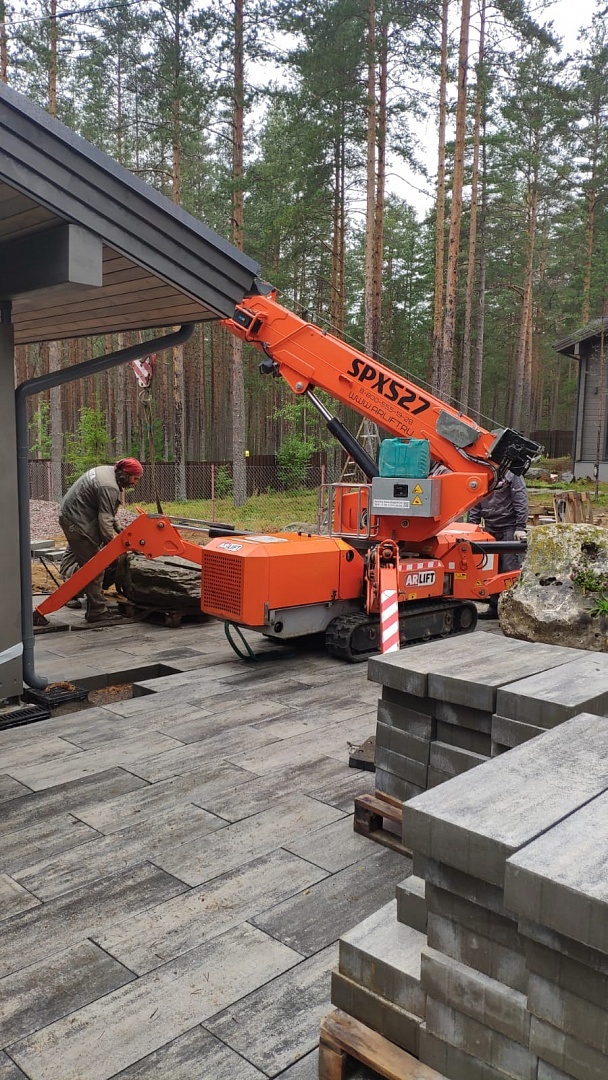 Так, мини-кран компании Арлифт, SPX527, совместно с ландшафтным бюро помог с переносом камней весом до 1600 кг. В общей сложности было перенесено более 20 тонн природного материала. Легкий вес оборудования, который составляет всего 3600 кг, позволяет применять технику на совершенно непригодных для обычных кранов поверхностях, мягкие прорезиненные гусеницы бережно относятся к газонам, тротуарной плитке.