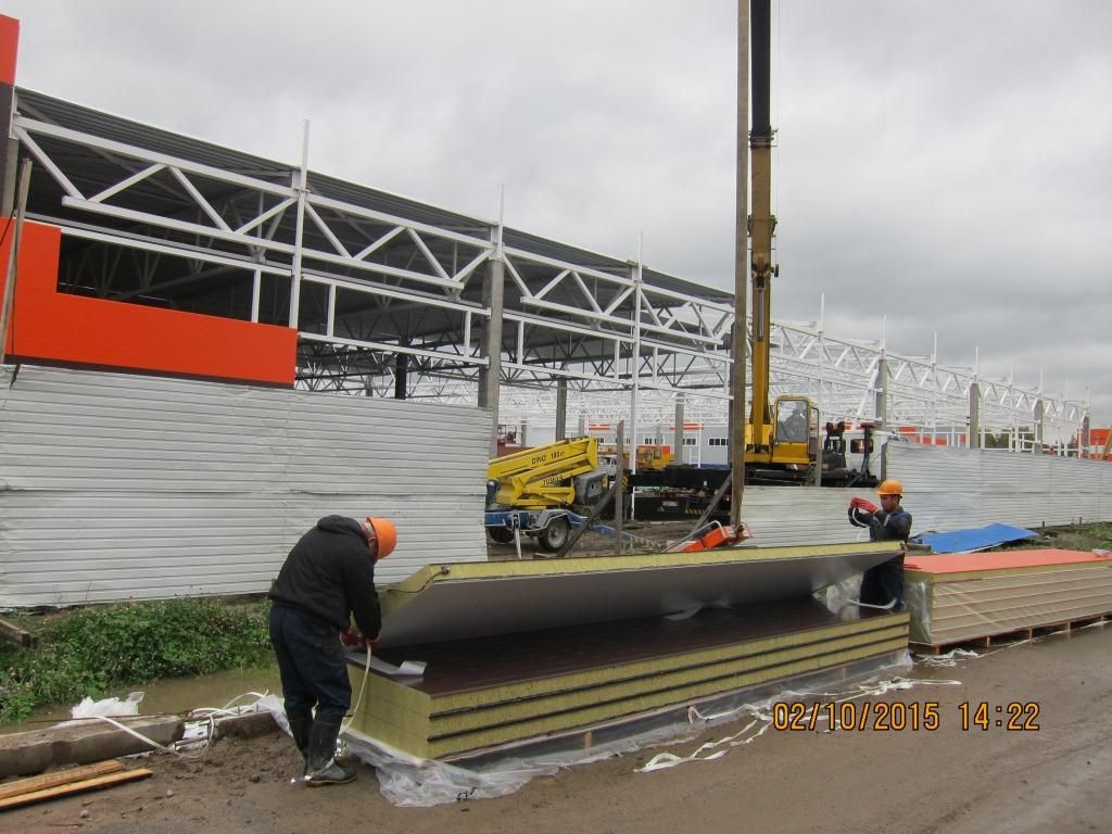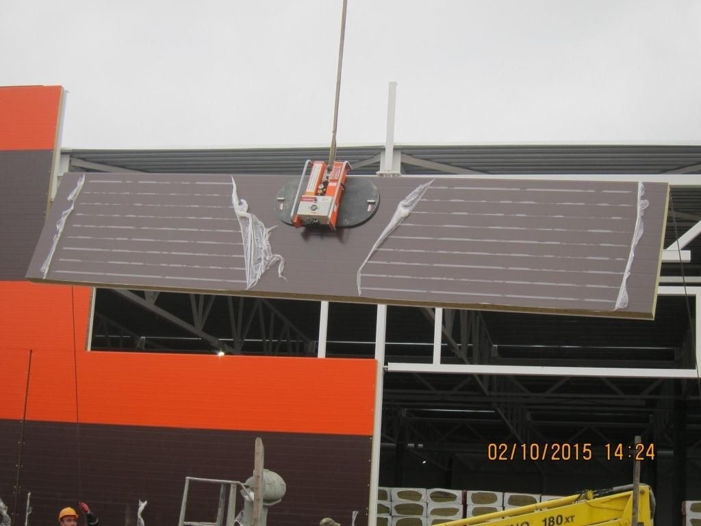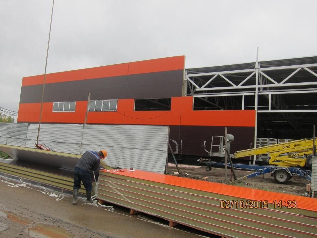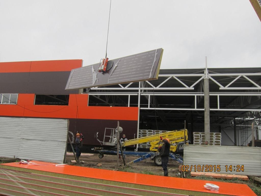 Горизонтальный монтаж сэндвич-панелей 8 метров. Мебельная фабрика на Индустриальном проспекте.