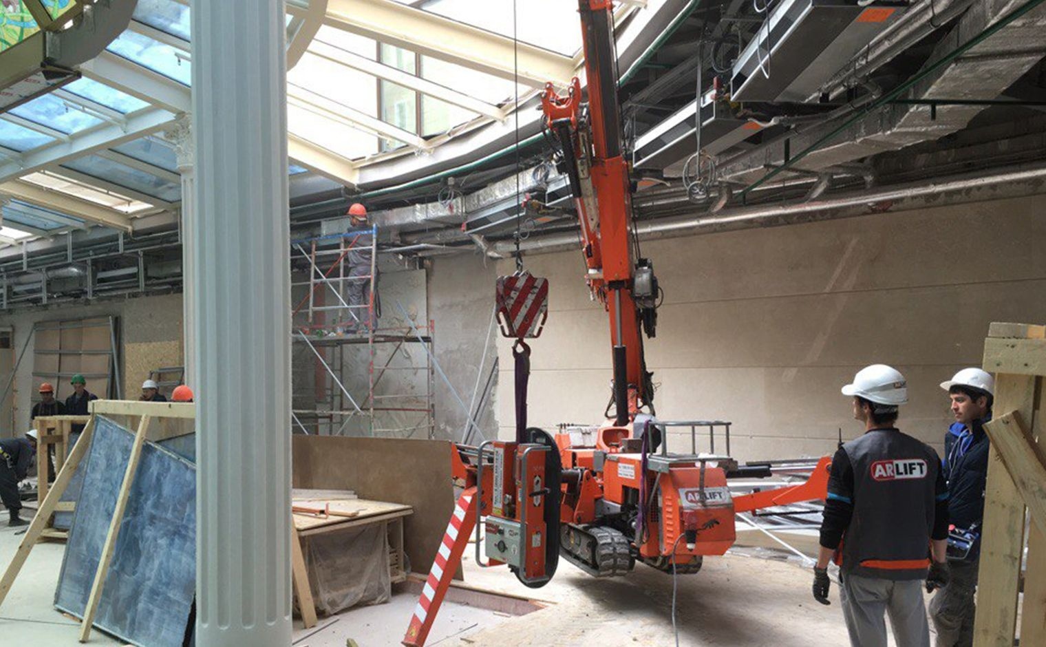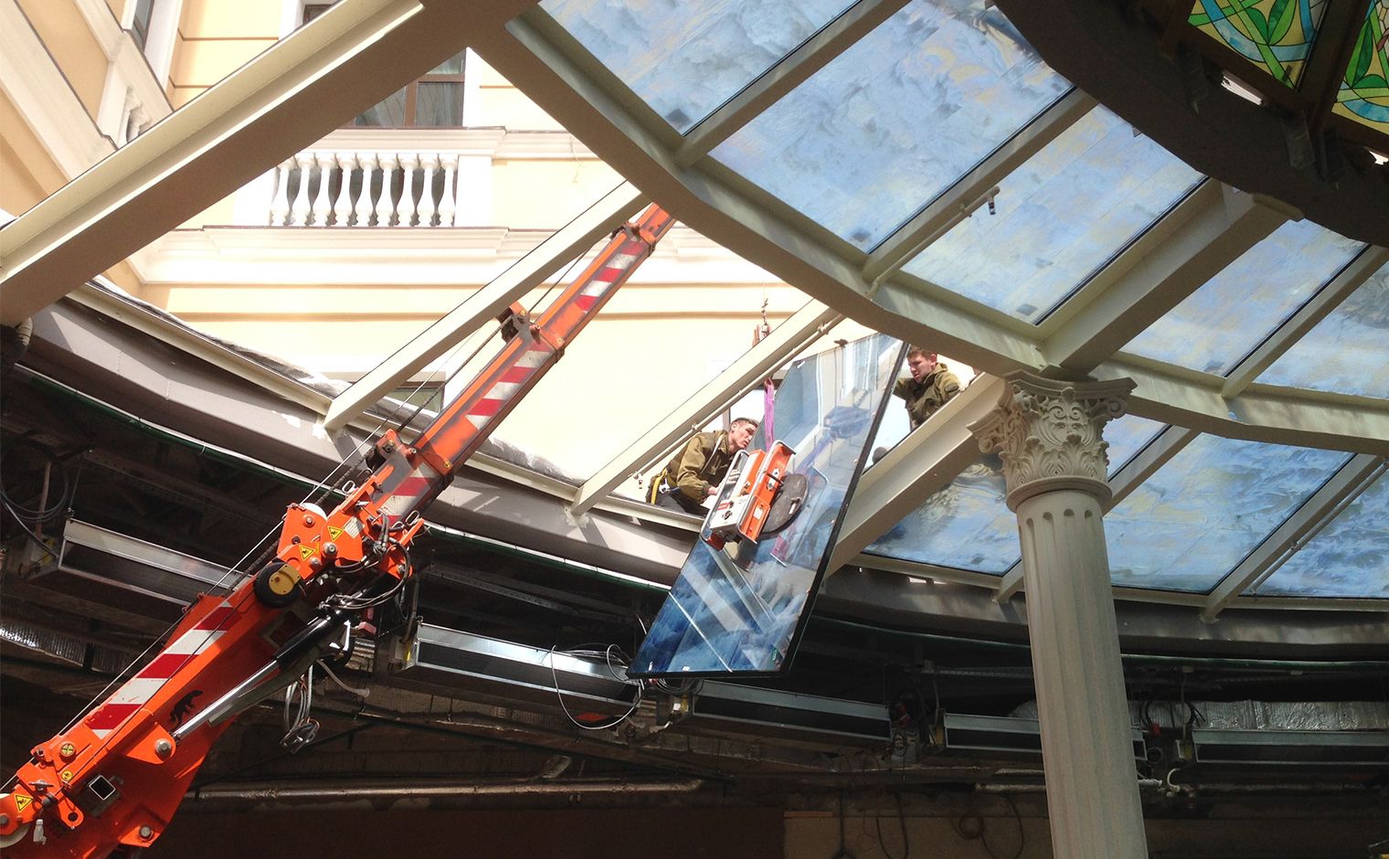 Реализация: остекление небесного цвета части потолка, а именно монтаж трехслойных стеклопакетов, состоящих из двух прозрачных стекол, между которыми расположен витраж небесного цвета, производился мини-краном JekkoSPD360 и вакуумным захватом для монтажа стекла “Арлифт”.