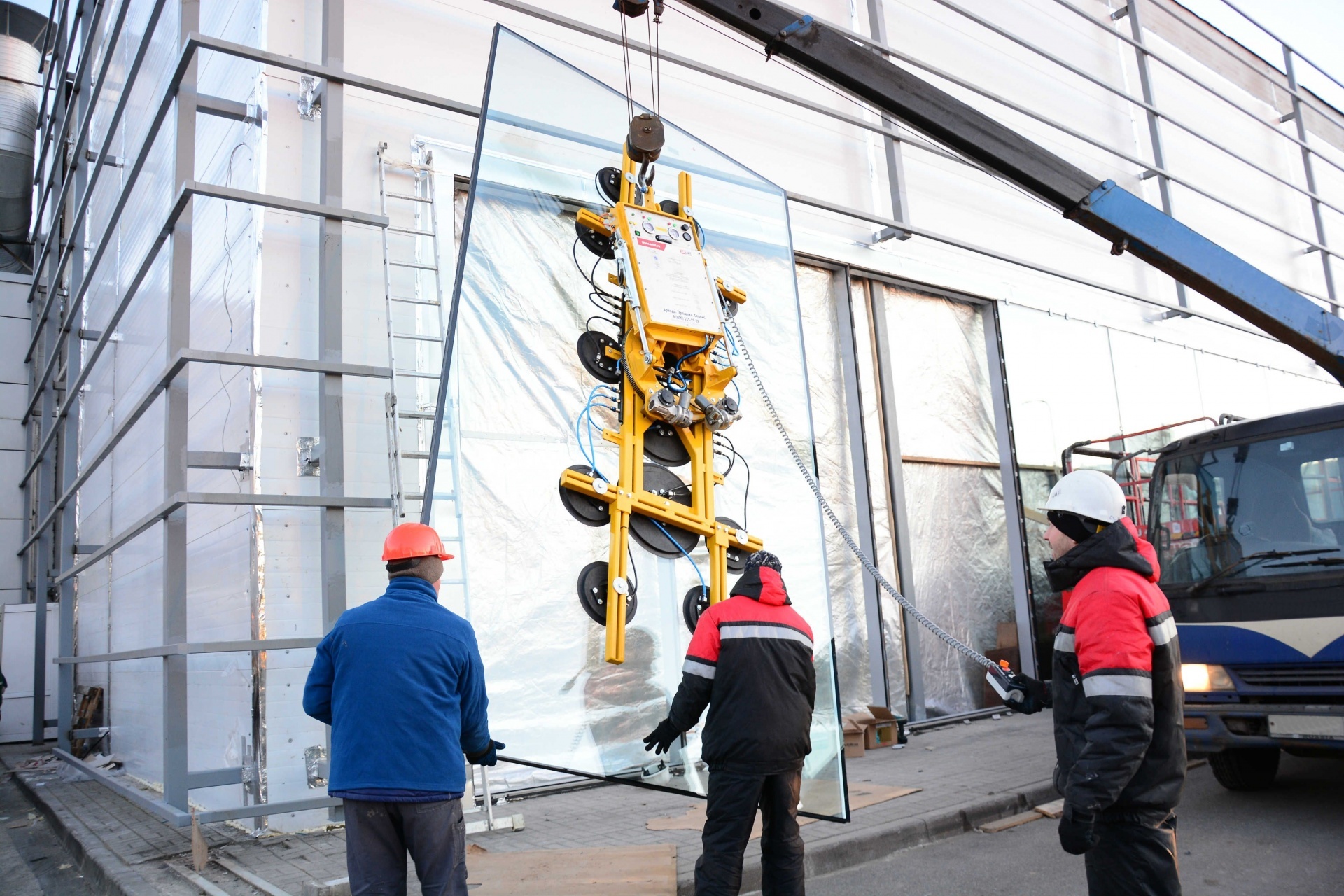 Причина выбора данного вакуумного захвата проста – оборудование GS серии способно монтировать стёкла весом до 600 килограмм, а так как стёкла большеразмерные (крупногабаритные), требовалась техника, конструкция которой позволяла бы полностью охватывать стеклопакет.
