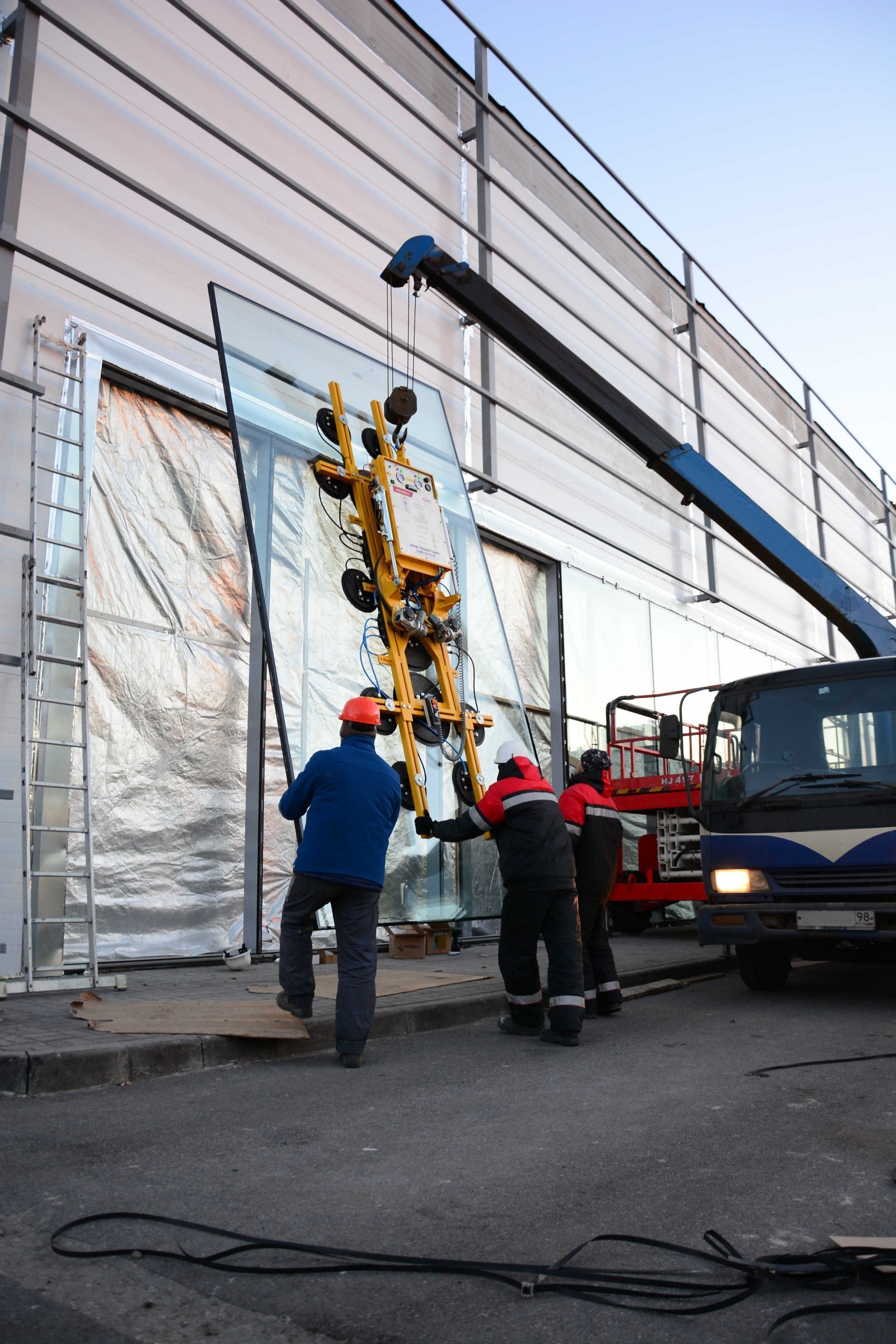 Главной задачей было выполнить замену тридцати полуструктурных стеклопакетов весом от 300 до 600 килограмм (ошибка) и размером 2,4 х 4,5 метра в рамках проекта по реконструкции "Ягуар-Лэнд Ровер Омега-Премиум".