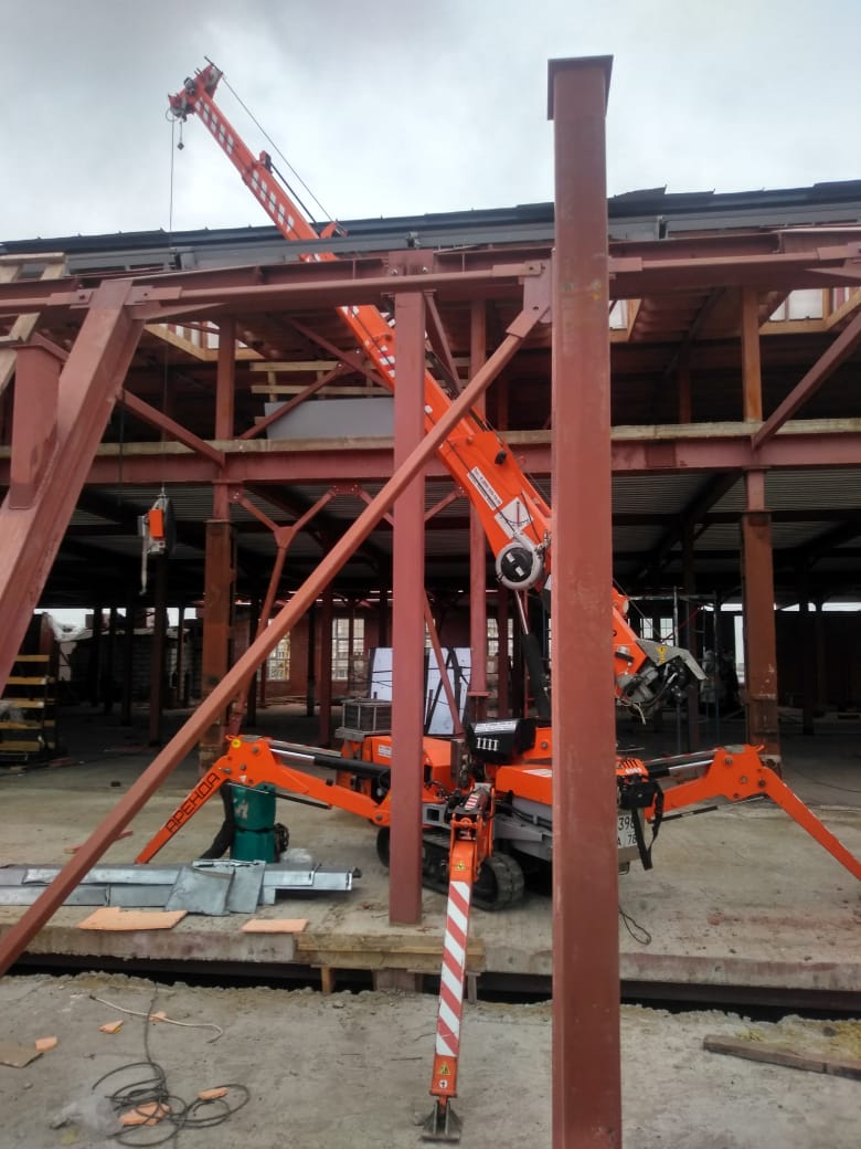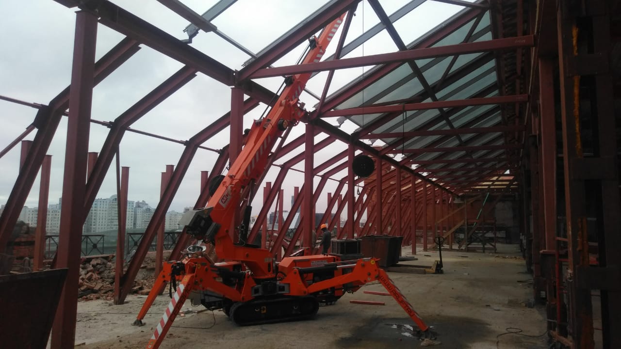 Располагаясь на плитах перекрытия внутри здания мини-кран SPD360CDH с ювелирной точностью подводил стрелу с вакуумной присоской на указанное место монтажа.