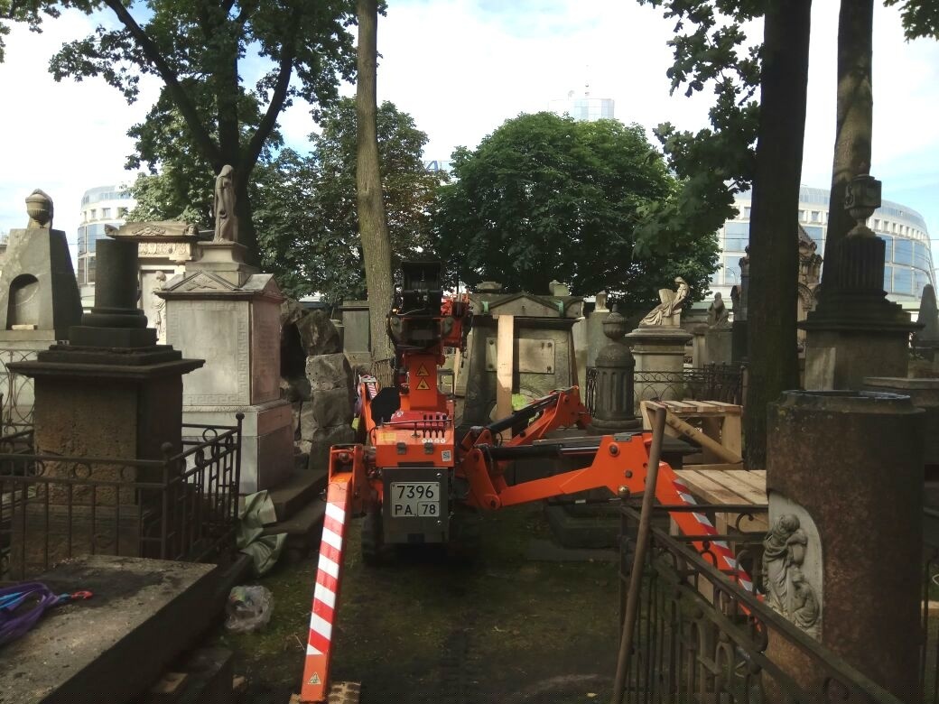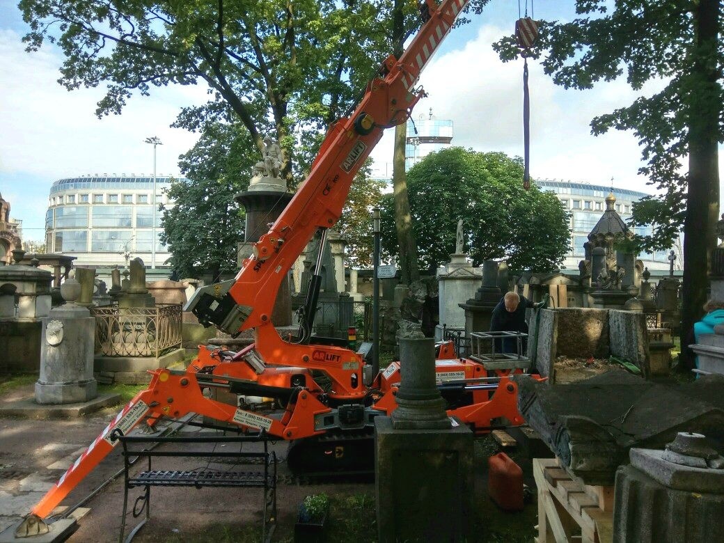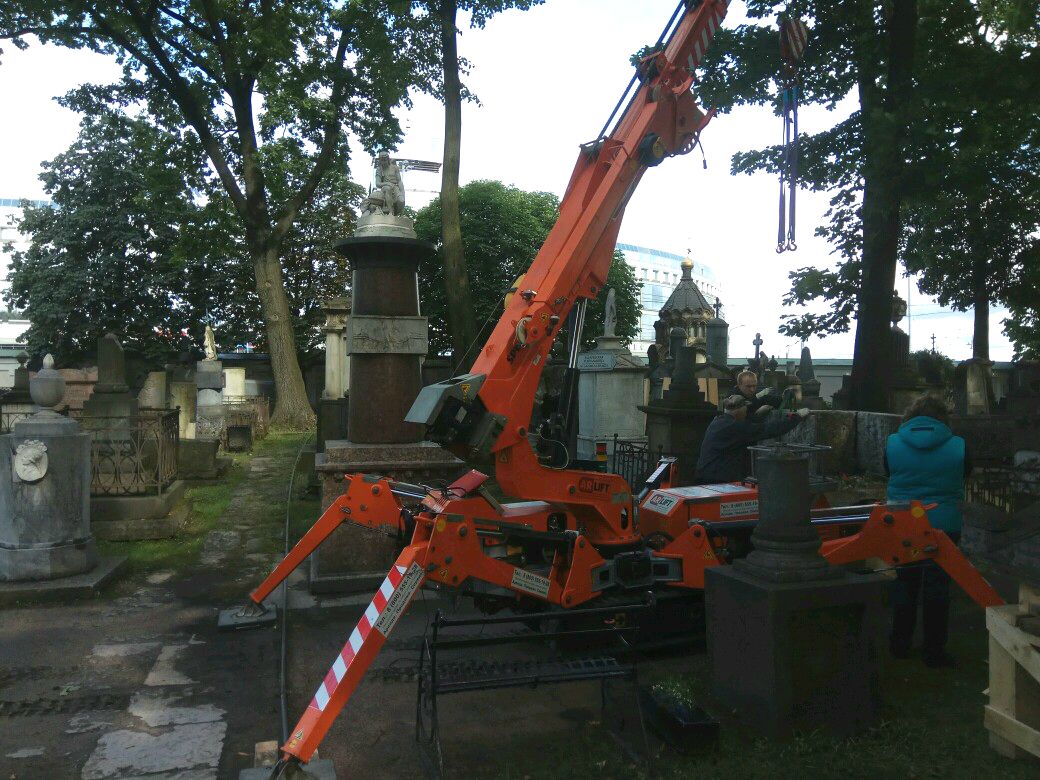 В данном случае крану требовалось очень аккуратно и компактно разместиться на объекте – на дорожках между могилами, не повредив окружающие памятники, осторожно демонтировав и переместив надгробие.