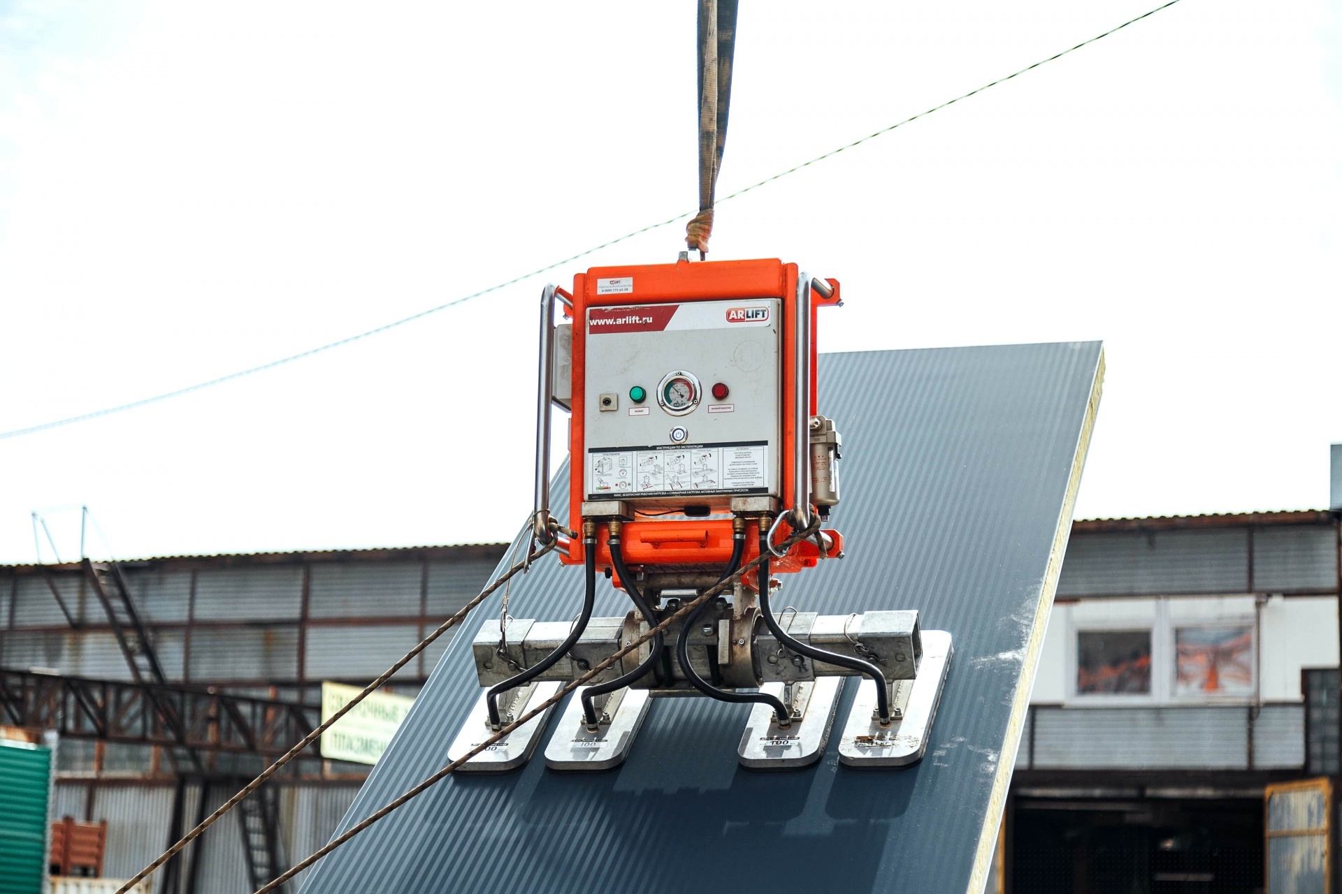 Для ее решения был выбран вакуумный захват ARLIFTER SP-4, который может производить монтаж стеновых и кровельных сэндвич-панелей до 26 метров.