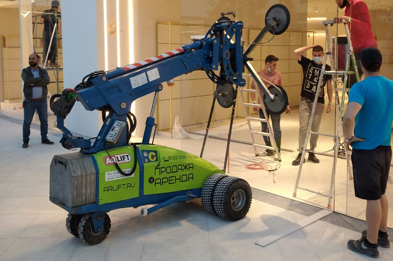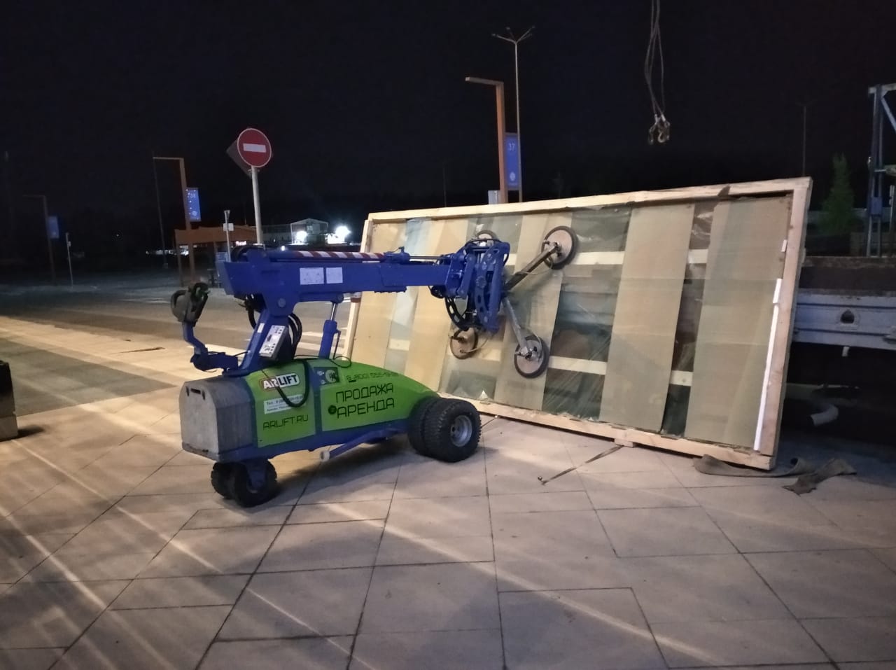 Крупногабаритные витринные стекла весом около 200 кг смонтировали с помощью стеклоробота Арлифт с максимальной грузоподъемностью 575 кг. Аккумуляторный самоходный вакуумный подъемник — идеальное решение для остекления веранды, балкона или витрины магазина.