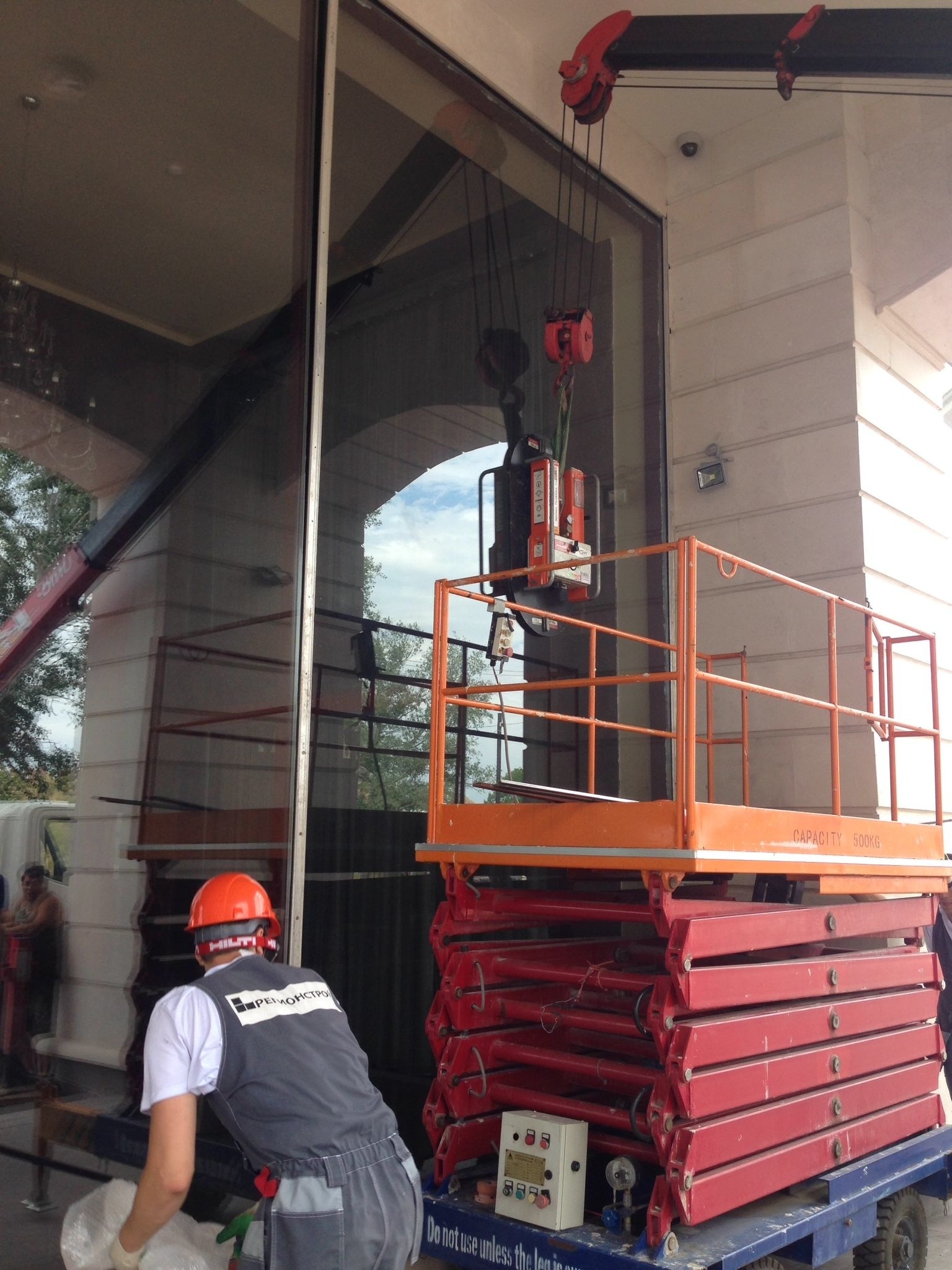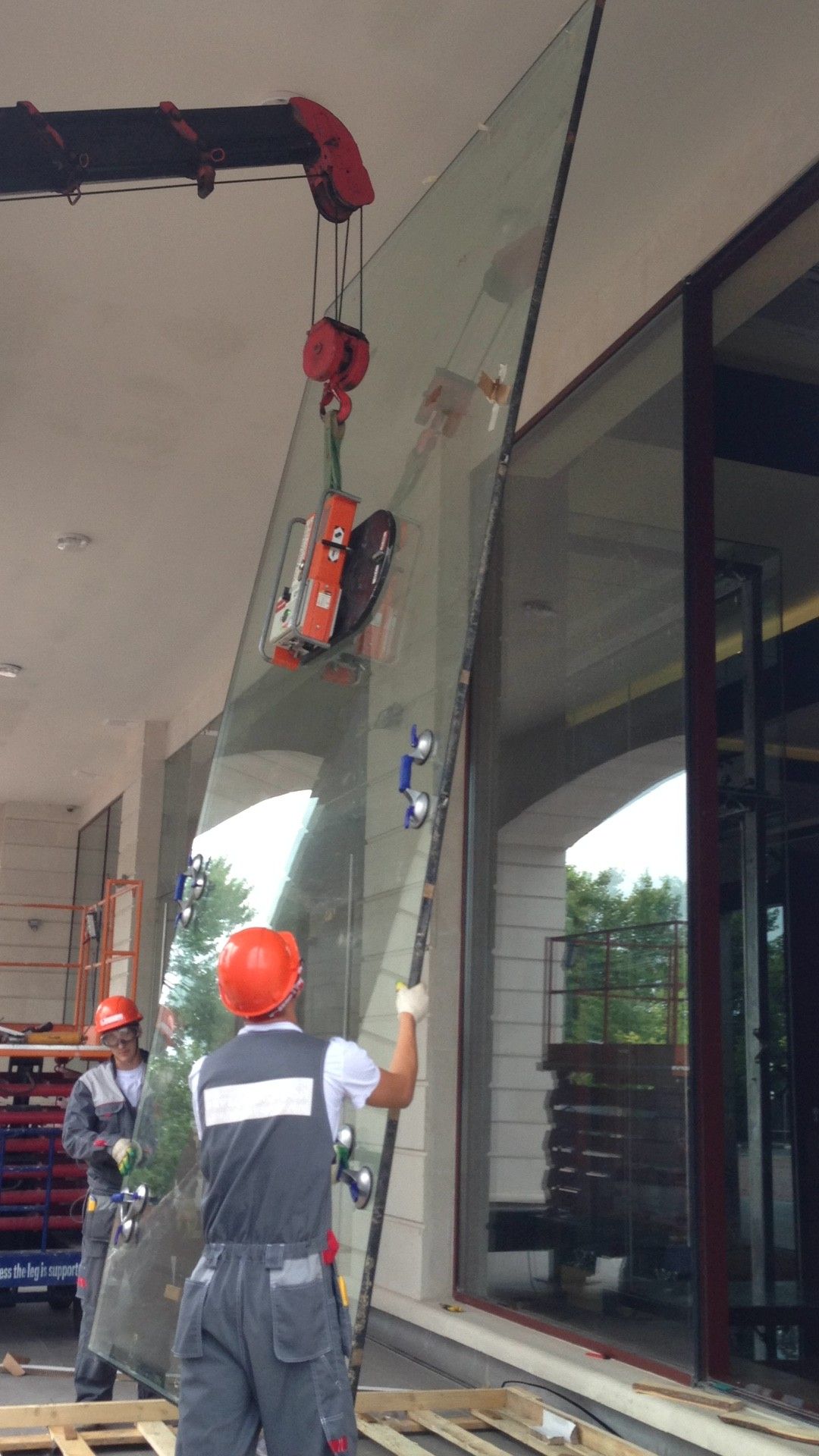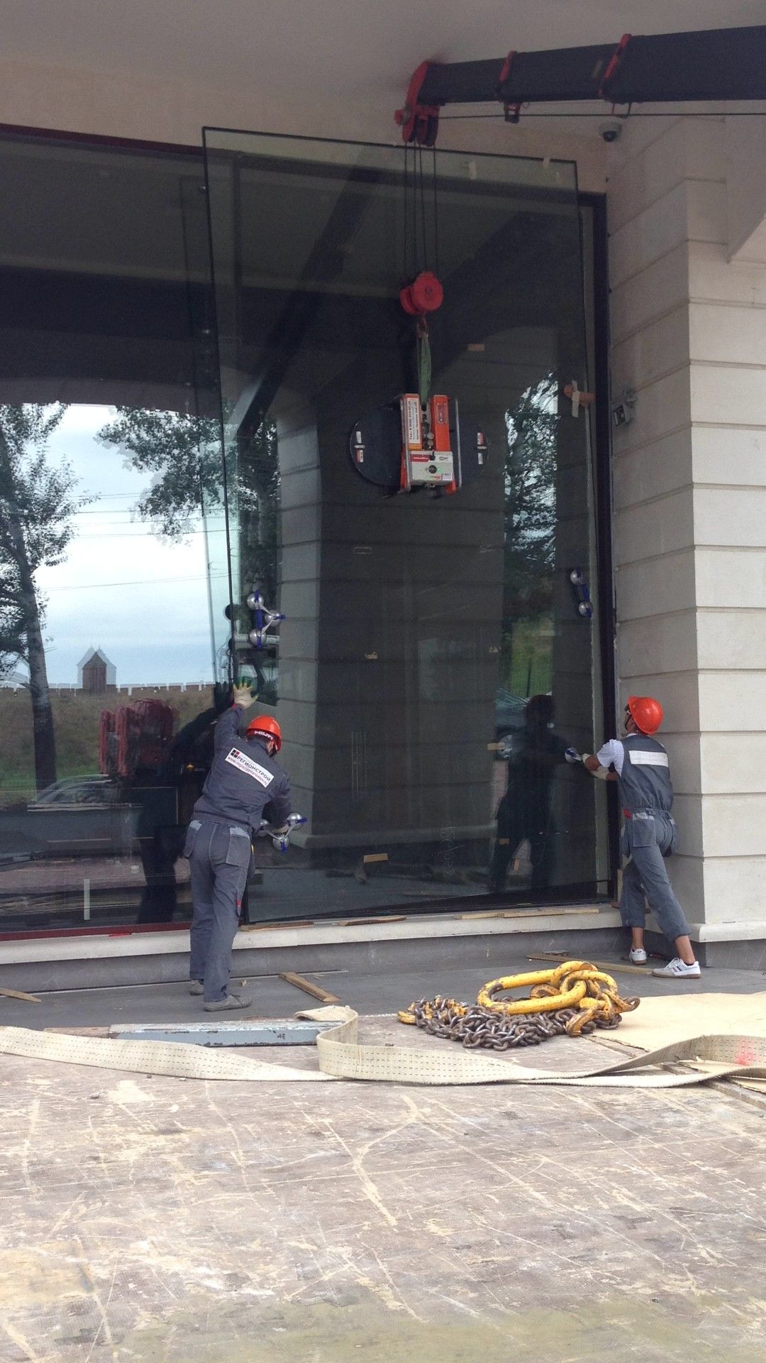 Монтаж стекла в Grand Hotel SOHO (г. Азов) с помощью вакуумного захвата ARLIFTER GS-500.