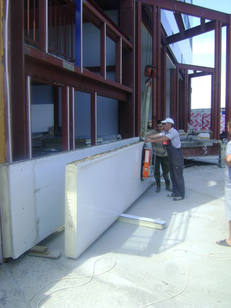 Горизонтальный монтаж 6-ти метровых сэндвич панелей с помощью ARLIFTER GS-500 с кронштейном развесовки.