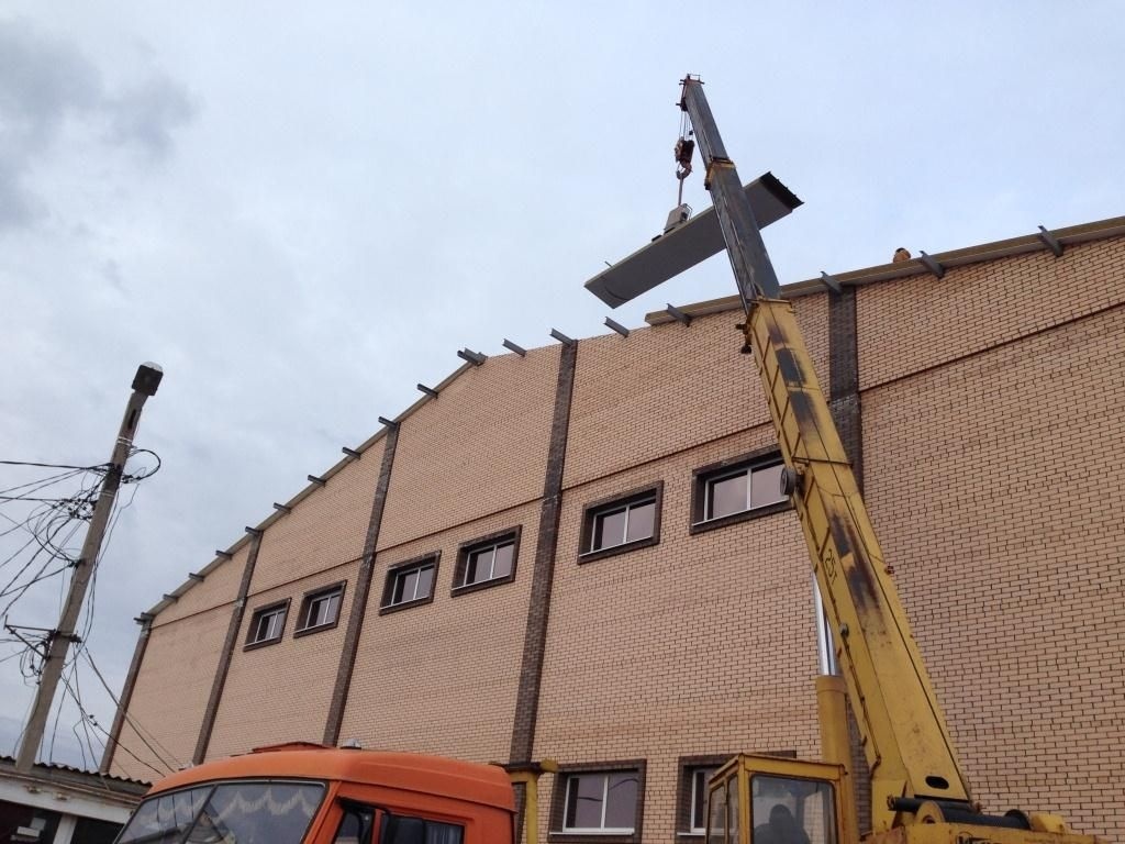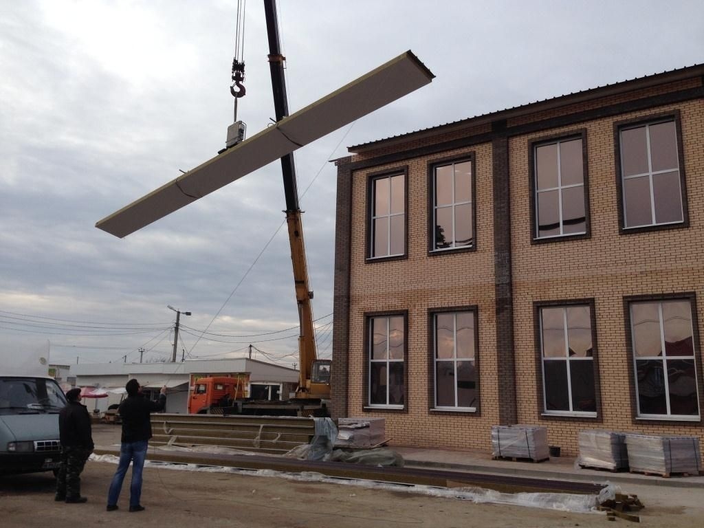Вертикальный монтаж 14 метровых сэндвич-панелей с помощью вакуумного захвата ARLIFTER SP-4.