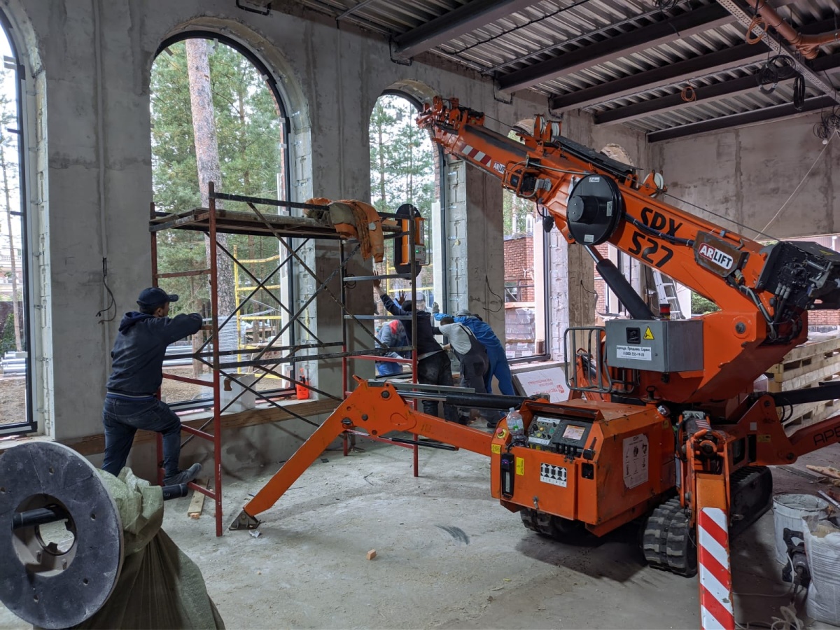 Монтаж стекла с помощью мини-крана Арлифт