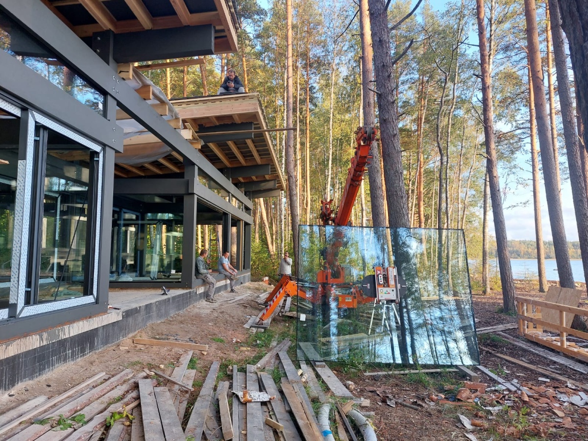 Мини-кран с вакуумным оборудованием помогает остеклить здание