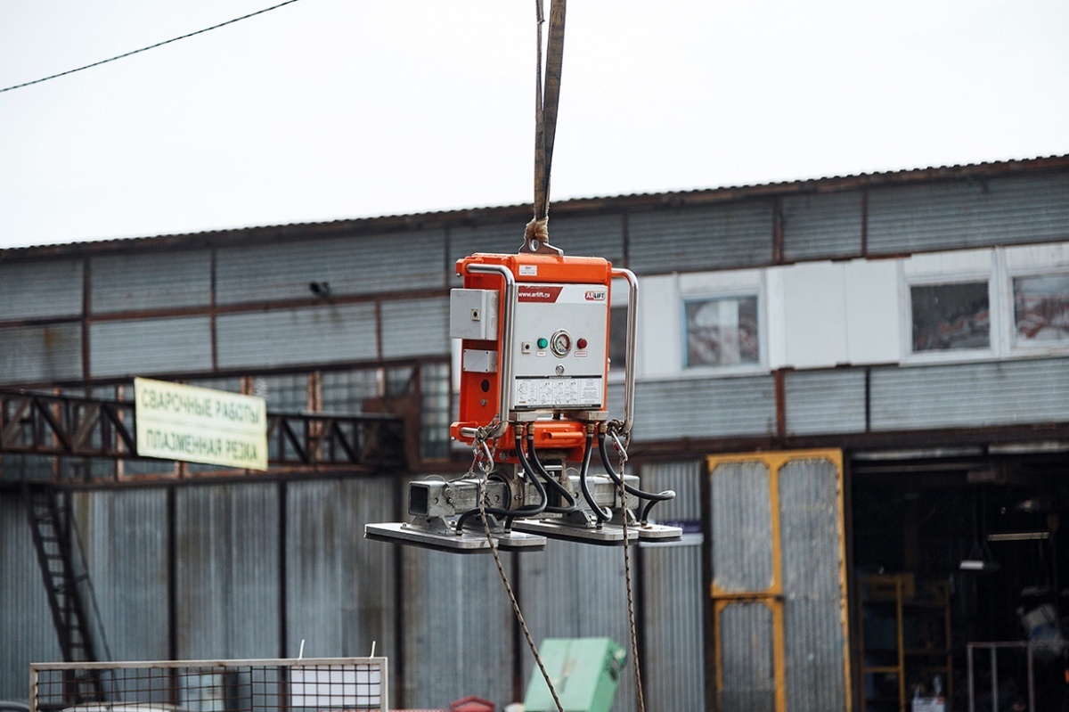 Вертикальный монтаж сэндвич-панелей вакуумным захватом